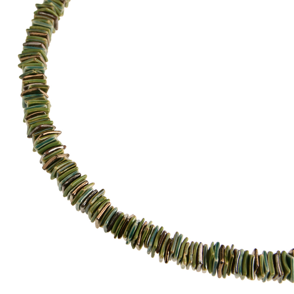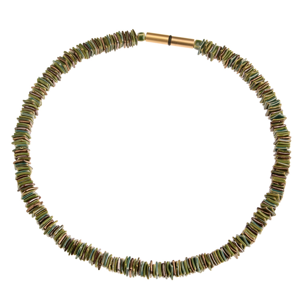 Halskette mit handgefertigten Keramikplättchen, der Verschluss ist aus Edelstahl, z.T. PVD beschichtet