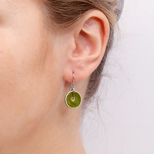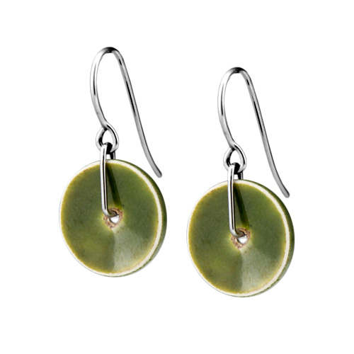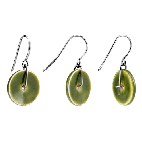 Ohrhänger als einfarbig glasierte Keramikscheibe mit Loch, leichter Innenwölbung und freigelegter Kante, in der Grösse ca. Ø 15 mm, Dicke ca. 2 mm
